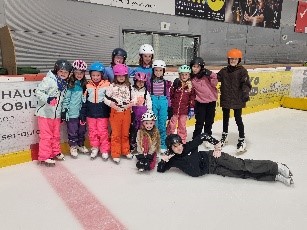 Bei der Eisbahn angekommen, zogen wir die Schlittschuhe an, montierten Helm und Handschuhe - schon konnte der Spass losgehen! Wir hatten sehr viel Platz, denn die ganze Halle war für uns reserviert. Für einige Kinder war es das erste Mal auf dem Eis. Zum Glück hatte es «Böckli», an welchen wir uns festhalten konnten. Andere Kinder rutschten und glitten schon sicher über die Eisfläche. Einige Schülerinnen und Schüler spielten Eishockey. So viel Spass und Bewegung machte hungrig. Zwischendurch assen wir das Znüni und das feine «Zmittag». Leider ging die Zeit zu schnell vorbei…